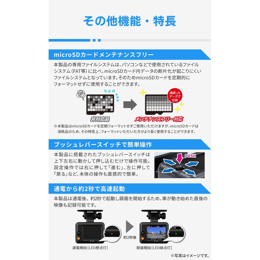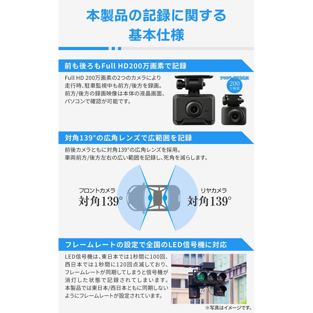 フロントカメラ部仕様:■撮像素子:1/2.7型 CMOSセンサー ■有効画素数:最大200万画素 ■レンズ画角:水平114° 垂直59°(対角139°) ■F値:2.1