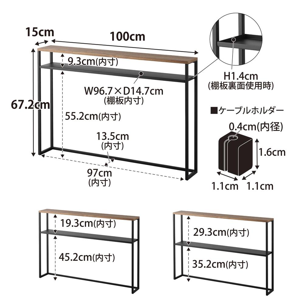 商品サイズ 本体:W100×D15×H67.2cm ケーブルホルダー:W1.1×D1.1×H1.6cm ▪商品重量:6100g ▪内寸 ケーブルホルダー内径:4mm 棚板:W96.7×D14.7cm 棚板より上部:H9.3・19.3・29.3cm 棚板より下部:H55.2・45.2・35.2cm