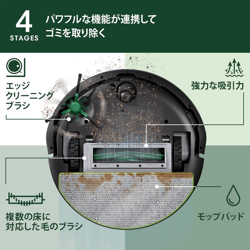 ?ゴミやホコリをしっかり除去 : 4段階クリーニングシステムでは、70倍強力になったパワーリフト吸引*、複数の床に対応した毛のブラシ、エッジクリーニングブラシがゴミやホコリを一掃し、マイクロファイバーモップパッドが床をピカピカに仕上げます。 *国内累計出荷台数トップのRoomba 600シリーズとの比較。(2025年2月時点)