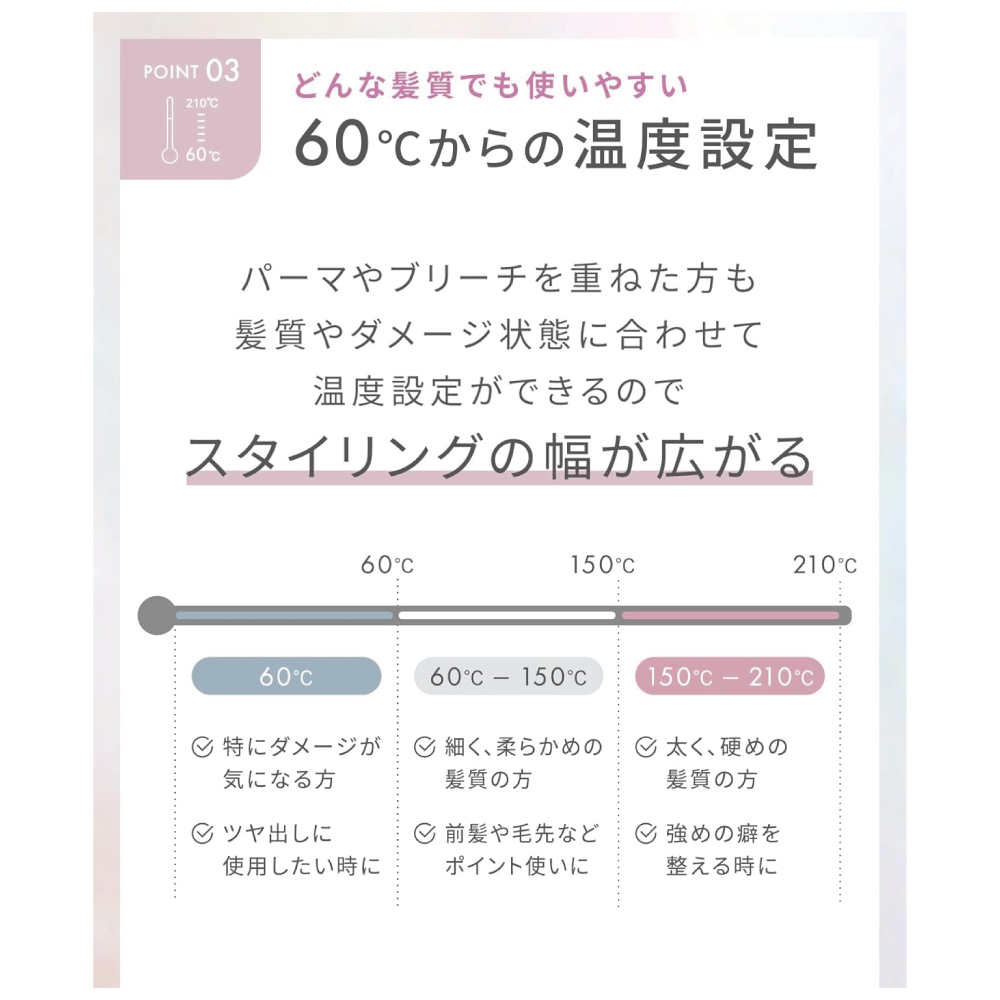 【60℃からの低温ケア】60〜210℃の幅広い温度でどんな髪質でも使いやすい。