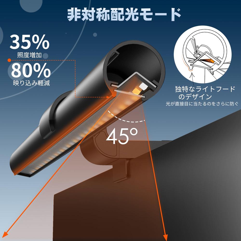 【非対称配光&光阻止フード】 バーライトの非対称な光学設計はデスクトップ作業エリアを照らし、独特な光阻止フードデザインで目に入る光を最大80%削減し、目を保護。内部の光板デザインで輝度を集中させ、照度を最大40%向上。モニター掛け式ライトの防滑ラバー付きの重力クリップはモニターに簡単に取り付け可能。ノートパソコンや曲面ディスプレイには対応していませんのでご注意ください。