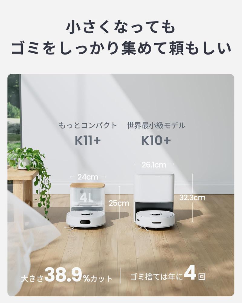 【世界最小級ロボット掃除機がさらに小さくパワフルに】前代モデルのK10+よりもステーションの体積を38.9%縮小しながら、4Lのゴミを収納可能。直径24.8㎝の世界最小級ボディで、ベッドやソファの下、ダイニングテーブルの脚周りまで、スイスイ走って徹底的にお掃除。重さもわずか2.3kgなので、片手で持ち上げて2階・3階へ。一戸建てのお宅にもぴったりです。