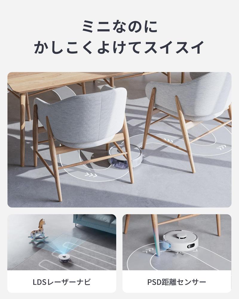 【スマートマッピング & 360°障害物回避】LDSレーザーSLAMを採用し、複雑な間取りのお部屋でも高精度なマップを構築。家具が多くても、散らかっていても、ダイニングテーブルやイスの脚が乱立する、「家具の脚の森」もスムーズに走行します。落下防止センサーで、玄関や階段などの段差から落ちる心配もいりません。侵入禁止エリアやバーチャルウォールもアプリから簡単に設定。