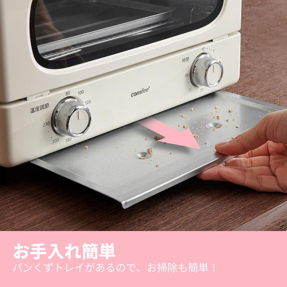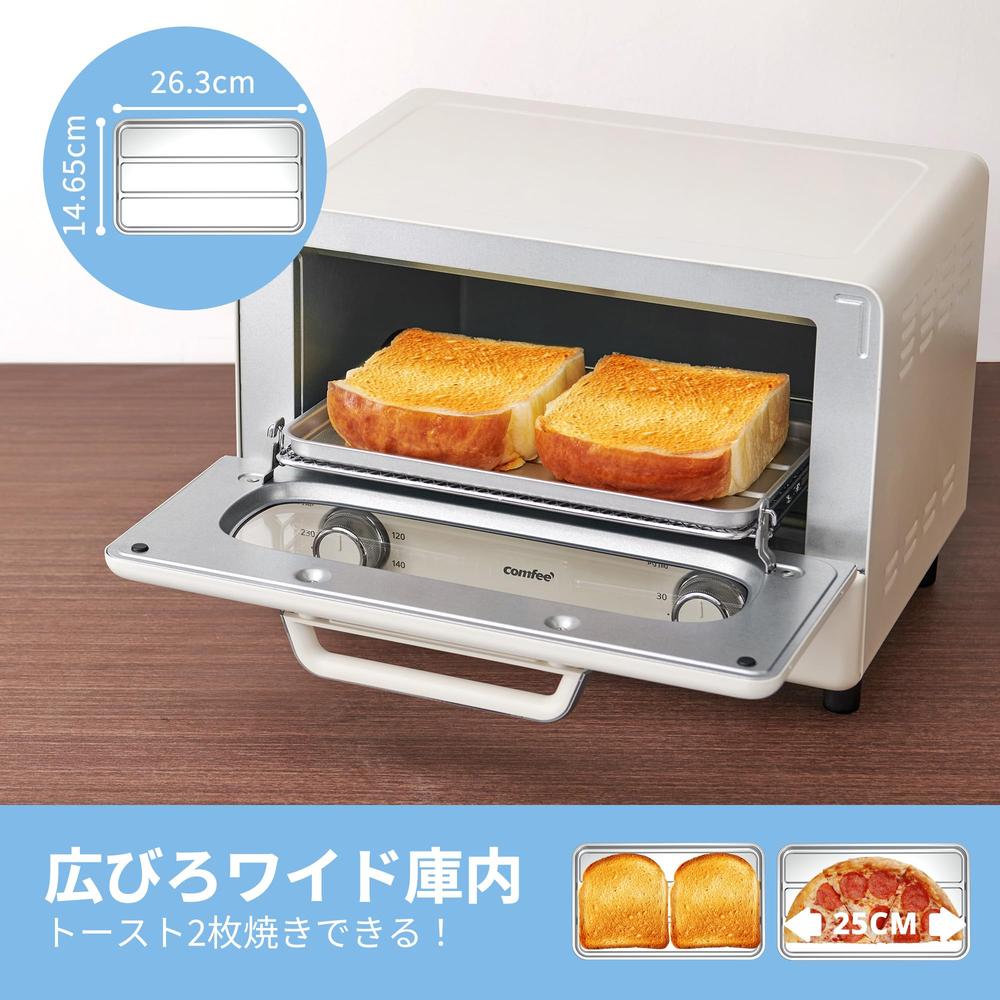 【商品仕様】COMFEE' レトロオーブントースターCF-MG101-AY:◇外形寸法:幅32.2*奥行27.7*高さ22.7cm、約3.3kg ◇庫内寸法:幅26*奥行き22.8*高さ19.8cm◇容量:トースト2枚焼き(25㎝ピサ) ◇電源:AC100V ◇最大出力:1000W ◇タイマー:最大30分 ◇ヒーター:2本 ◇温度範囲:80-230℃◇付属品:パンくずトレイ*1・日本語取扱説明書◇設置:散熱のため、上は10㎝、周囲は4.5㎝の隙間を開けてください※ 製品保証期間:一年間