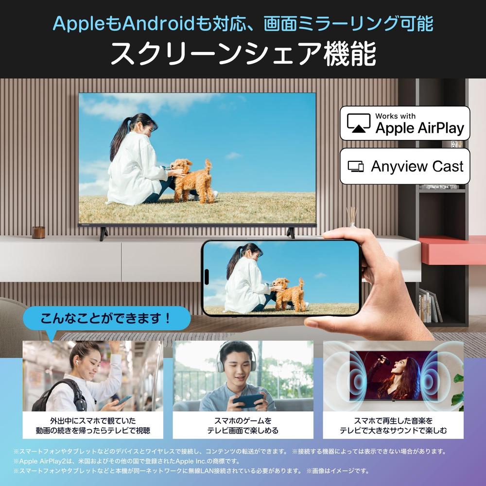 【スクリーンシェア機能】 スマートフォンの画面をテレビに映し出せます。スマートフォンで撮影した写真や動画を皆で見て楽しめます。(Apple、Androidデバイス対応)