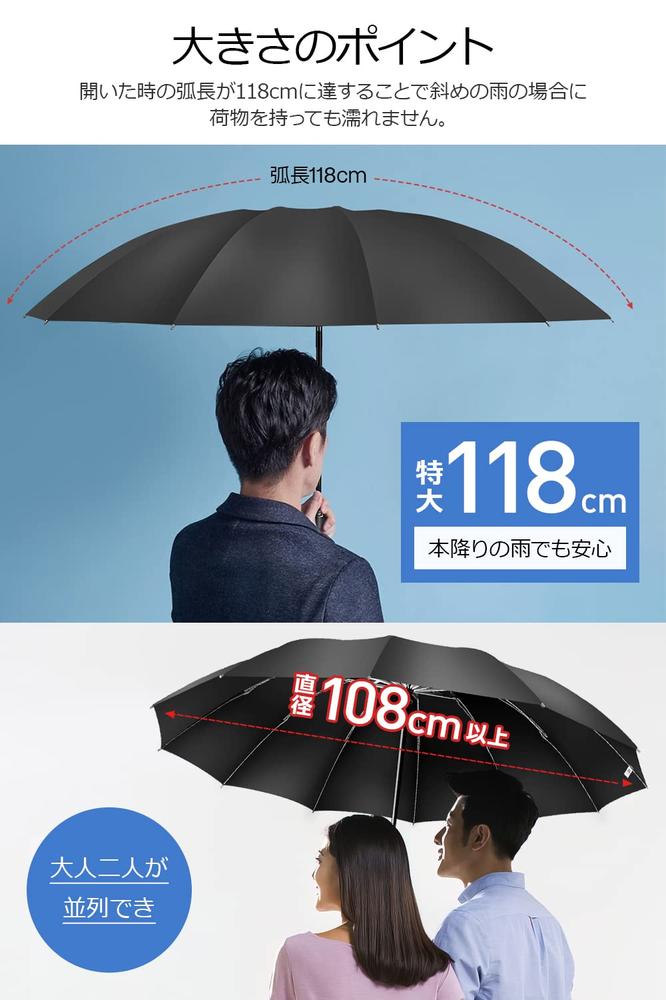 【濡れにくい大判折りたたみ傘】開いた状態で直径約108cm、曲面約118cmもある大きさで、通常の紳士傘に比べて、傘を差しながら荷物を持っていてもリュックを背負っていてもしっかりカバーしてくれて、ほとんど濡れません。体の大きな男性も窮屈さを感じることなく快適に使えます。折りたたむと長さ約32cmとなり、急な雨に備えてカバンなどに簡単に収納できます。