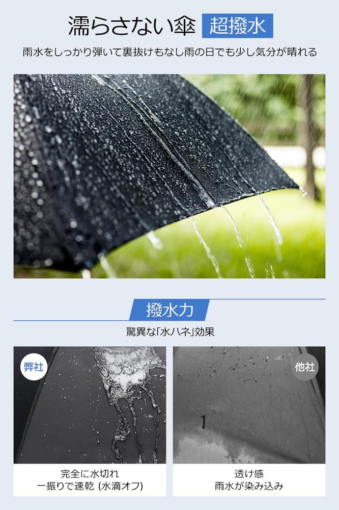 【超撥水性の逆折り式折畳み傘】高密度傘面に防水性の高いテフロン加工を施され、撥水性に優れていて、雨が傘に落ちたら水玉になりコロコロと滑り落ちていき、傘を閉じた後、数回振るだけで水滴を振り落とせます。そして、傘を畳むと濡れた面が内側にしまうので、雨水が服やカバンを濡らすことが少ない、車やタクシーに乗っても水滴が席につく心配はなく、電車、バスや人混みの中でも周りに迷惑を掛けずに済んで便利です。