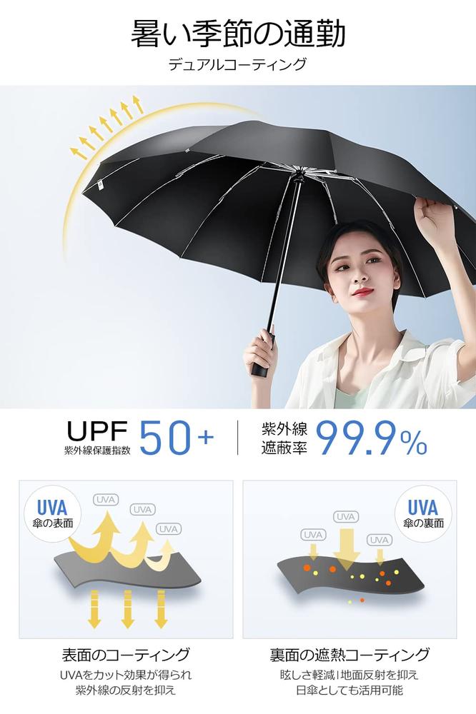 【晴雨兼用ワンタッチ自動開閉傘】裏側に遮光性バッチリなブラックコーティングを採用し、日差しの強い日も太陽光を通さずにカットし、紫外線から肌を守ってくれます。暑い季節で日傘として利用可能。ボタンを押すだけで片手でもサッと簡単に開閉できるワンタッチ式折りたたみ傘で、手荷物が多いとき、車やバスなどの乗り降りの際にとても楽です。カバンや車の中に常備していると大変便利です。