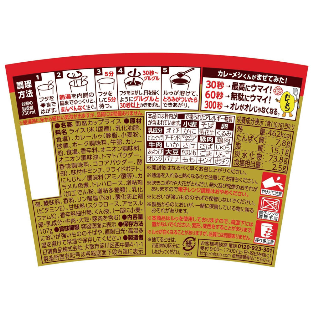 ライス(米(国産)、乳化油脂、食塩)、カレールゥ(豚脂、小麦粉、砂糖、ポーク調味料、牛脂、カレー粉、食塩、香辛料、オニオン調味料、オニオン調味油、トマトパウダー、香味調味料、ココアパウダー、酵母)、味付牛ミンチ、フライドポテト、にんじん/調味料(アミノ酸等)、カラメル色素、トレハロース、増粘剤(加工でん粉、増粘多糖類)、乳化剤、酸味料、香料、リン酸塩(Na)、酸化防止剤(ビタミンE)、甘味料(スクラロース、アセスルファムK)、香辛料抽出物、くん液、(一部に小麦・卵・乳成分・牛肉・大豆・豚肉を含む)