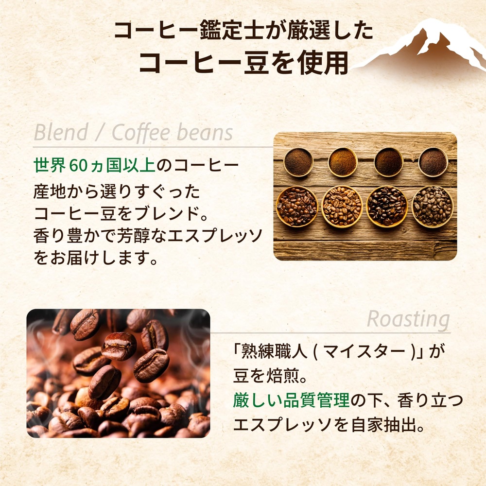 【コーヒー鑑定士が厳選したコーヒー豆!世界60ヶ国のコーヒー豆を使用】香り豊かで芳醇なエスプレッソをお届けするために、ダテーラ農園をはじめ、世界各国の品質の確かなコーヒー豆を使用。