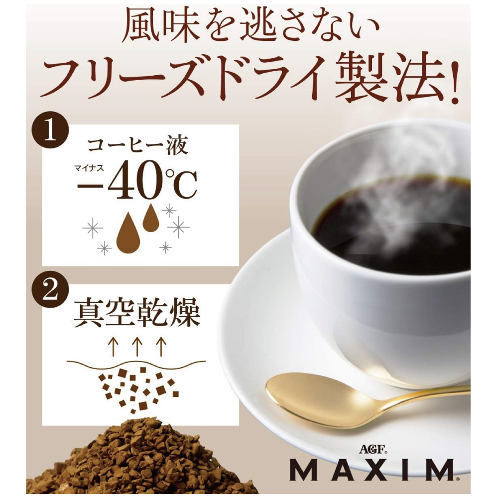 「この味、まずはストレートで。」「Maxim(マキシム)」 インスタント・コーヒーは、厳選したコーヒー豆をAGF独自の「T2ACMI焙煎」技術を用いて丁寧に焙煎。熱をかけずに-40℃で真空乾燥させるフリーズドライ製法なので、コーヒー本来の豊かな香りとコクの風味を逃さずに、淹れたてのコーヒーの味わいをお楽しみいただけるインスタントコーヒーです。