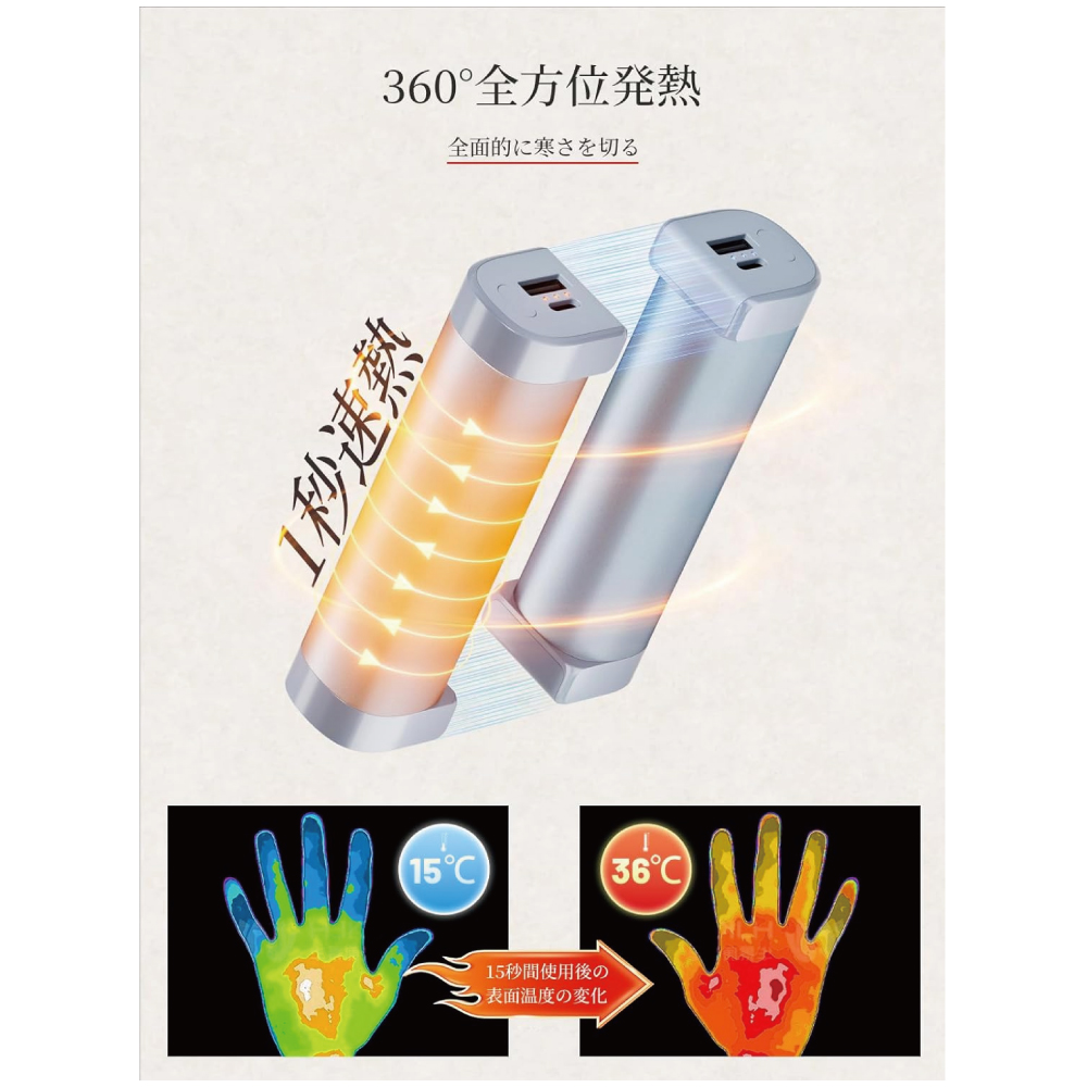 充電するだけで、繰り返し使えるエコなカイロが新登場!寒さが厳しい日でも、スイッチを入れてたった1秒ですぐ温もりを実感。手先の冷えが気になる時も、サッと取り出して即効暖まろう。360°全面発熱設計でどこを持ってもまんべんなく温かく。握り方や置き場所を選ばず、じんわり持続的なあたたかさが続きます。繰り返し充電可能なので、使い捨てカイロよりも経済的&地球に優しい。高い保温性能で、アウトドアや通勤・通学、オフィスでも大活躍!
