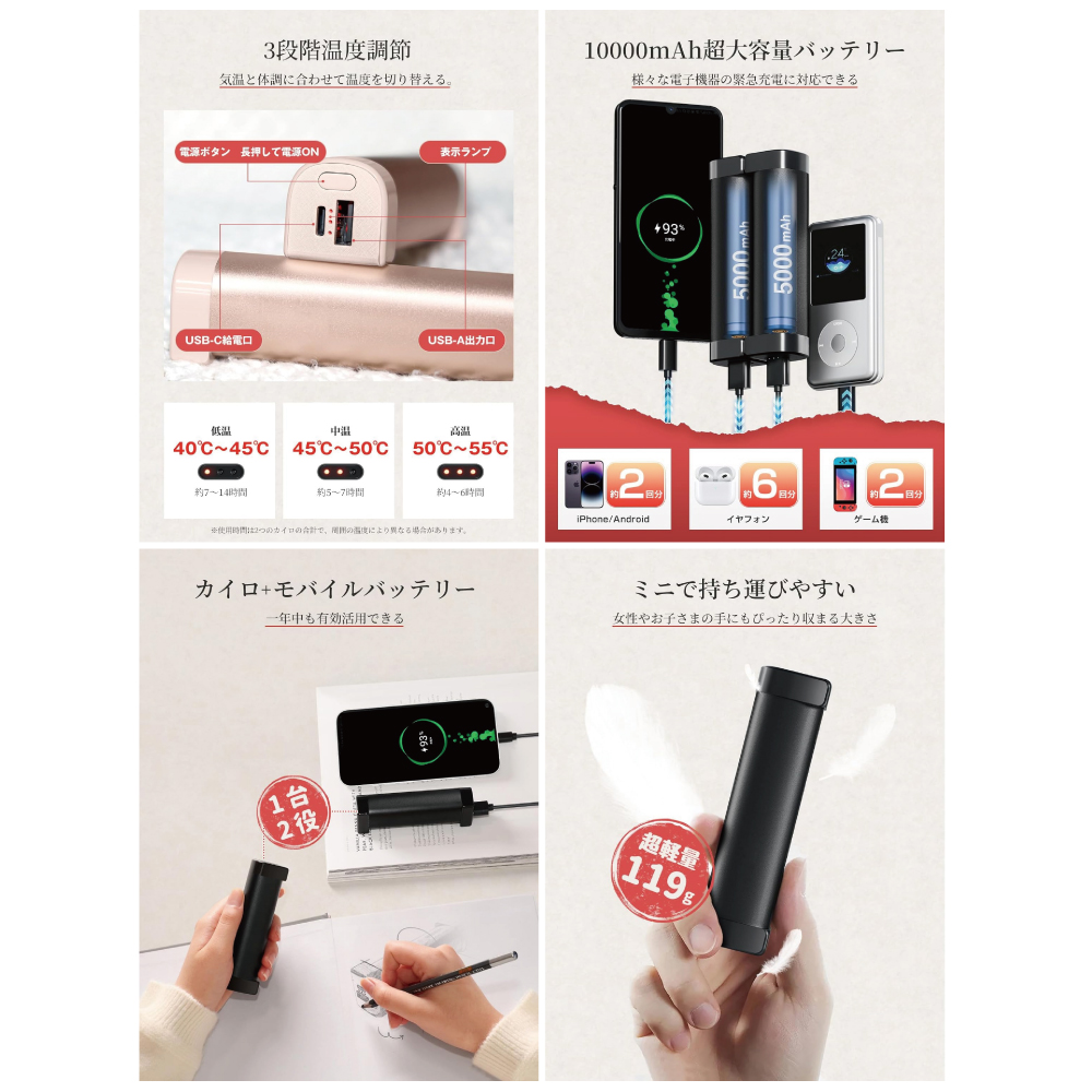 カイロにもモバイルバッテリーにもなる、冬の最強マルチアイテム!10000mAh(5000mAh×2)の大容量バッテリー搭載、ハンドウォーマーとしてだけでなく、スマホ・タブットなどの充電も可能。1つを温めながら、もう1つで充電。外出がぐっと楽になる!