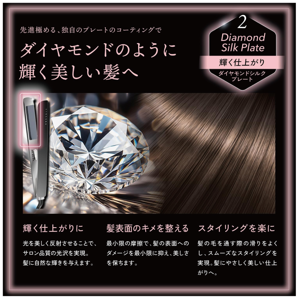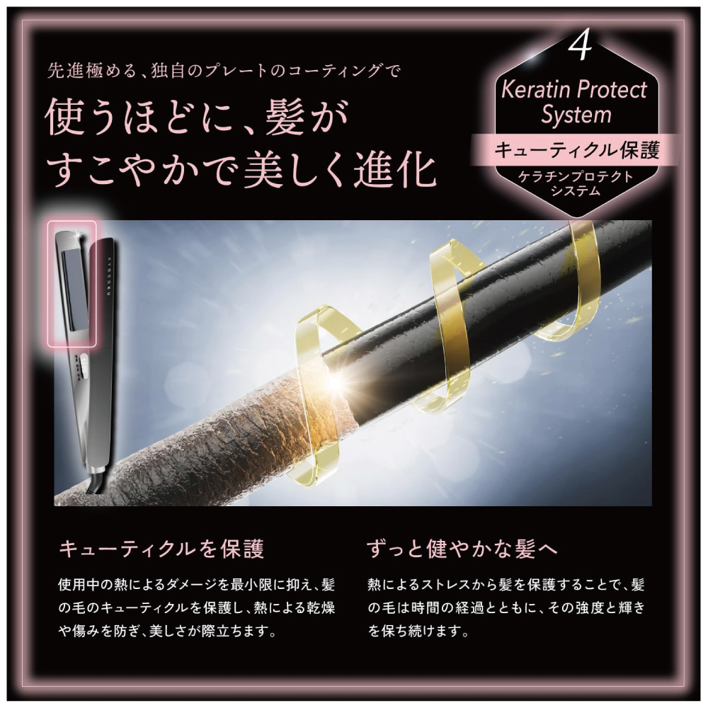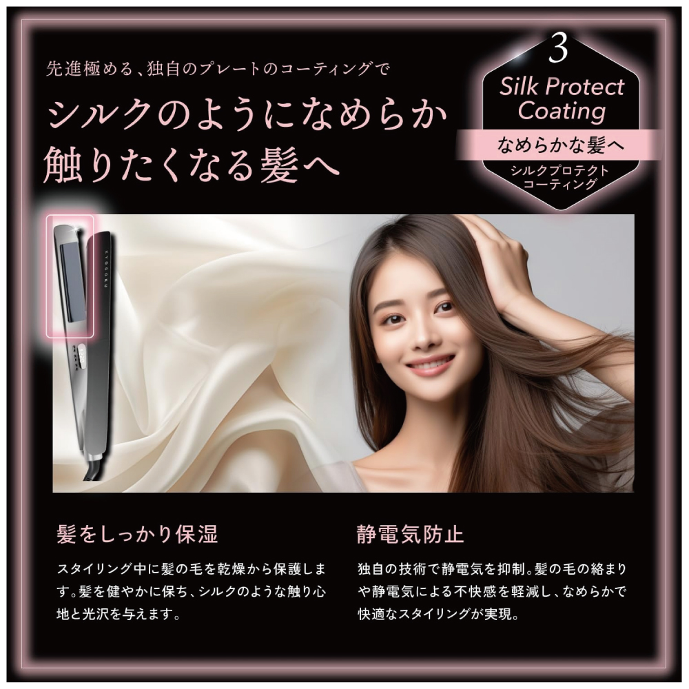【シルクプロテクトコーティングで滑らかな髪へ】 独自のプレートコーティングで静電気の発生を抑制し、髪の毛の絡まりや不快感を抑え滑らかな手触りに仕上げます。髪の毛の水分を逃がさず乾燥から保護するため、パサパサ感のないシルクのような手触りになり、光沢のある髪質へ導きます。
